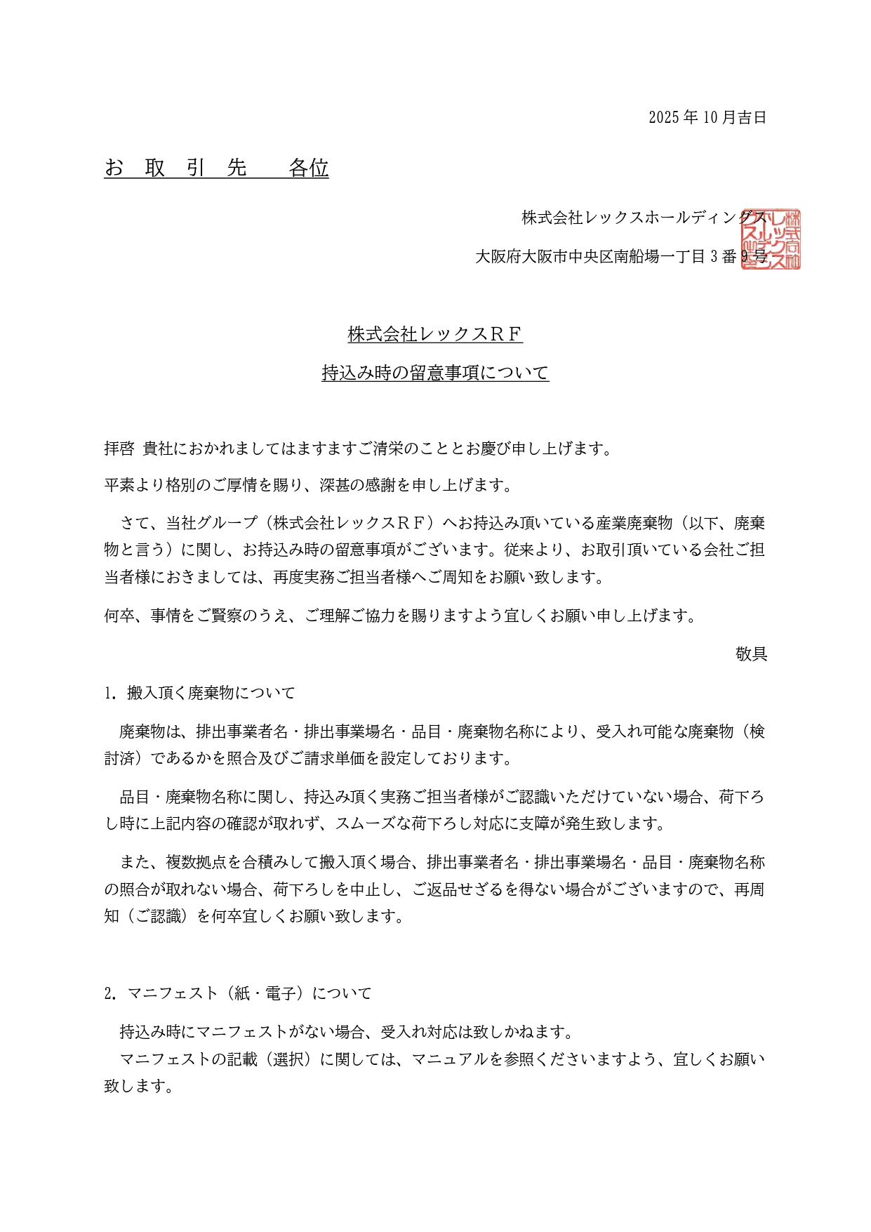 株式会社レックスRFへ産業廃棄物をお持込みいただく際の留意事項について、改めてご案内申し上げます。