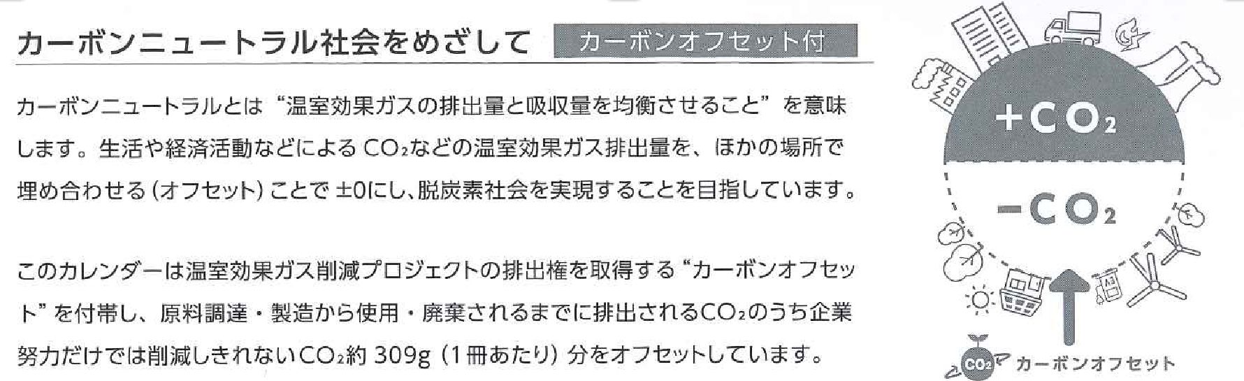 このカレンダーは、製造・流通の過程で発生するCO₂排出量を算定し、再生可能エネルギー事業や森林保全などの温室効果ガス削減プロジェクトを通じて同量のCO₂をオフセット(相殺)する仕組みを採用しています。