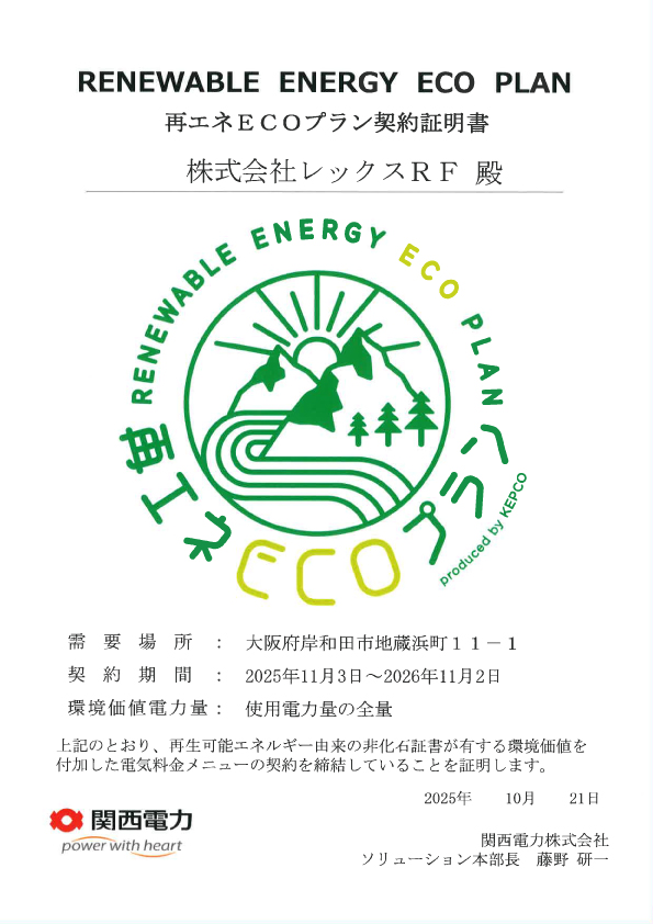 株式会社レックスRFは、環境への配慮をさらに強化するため、工場で使用する高圧電力について、11月3日より関西電力株式会社の「再エネECOプラン」への切り替えを実施いたします。